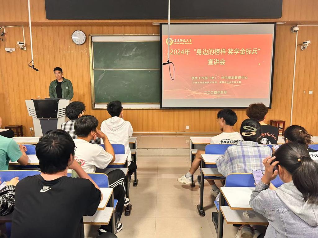 为深入学习贯彻党的二十大精神和习近平新时代中国特色社会主义思想,进一步拓展学生资助工作的育人功能,充分发挥奖学金获得者青年榜样的先进典型导向作用,4月18日,完美体育平台官网联合计算机与信息技术学院在计算机楼107教室召开了2024年“身边的榜样·奖学金标兵”宣讲会。学院2023和2022级学生参加了宣讲会。